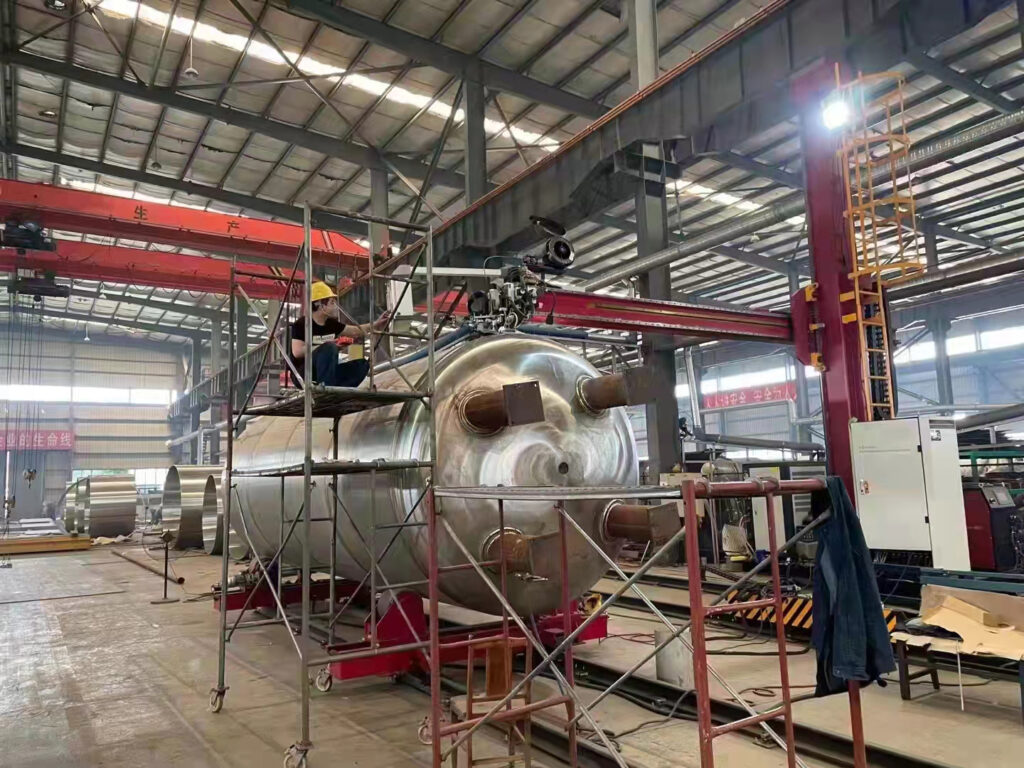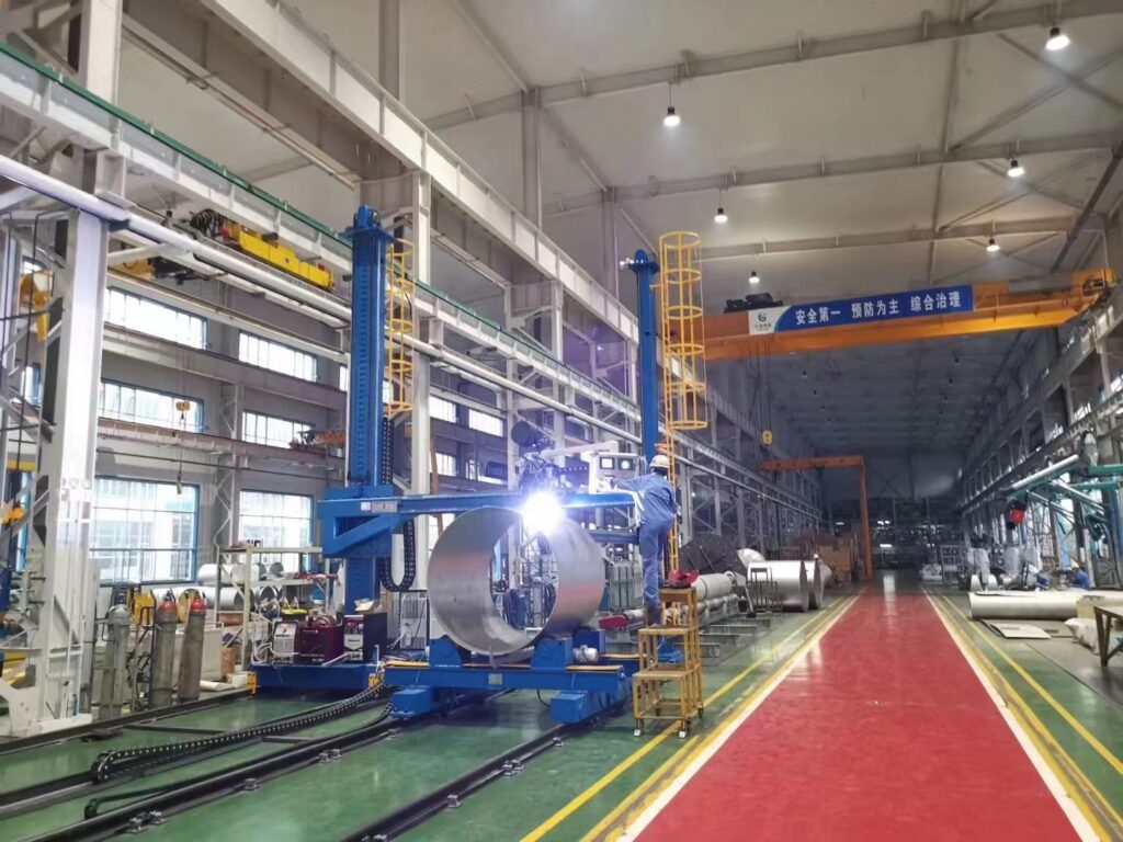 该HJ系列悬臂式筒体直环缝自动焊机主要用于压力容器筒体在钢板卷圆后的直缝焊接、两节或多节筒体接长环缝焊接及筒体与封头、法兰的环缝焊接,该设备由十字悬臂焊接机、驱动滚轮架及焊接电源等组成,采用滚轮架驱动工件旋转,焊枪相对固定焊接环缝;采用工件不动,十字悬臂焊接机悬臂升缩焊接直缝,是压力容器生产制作的理想装备。