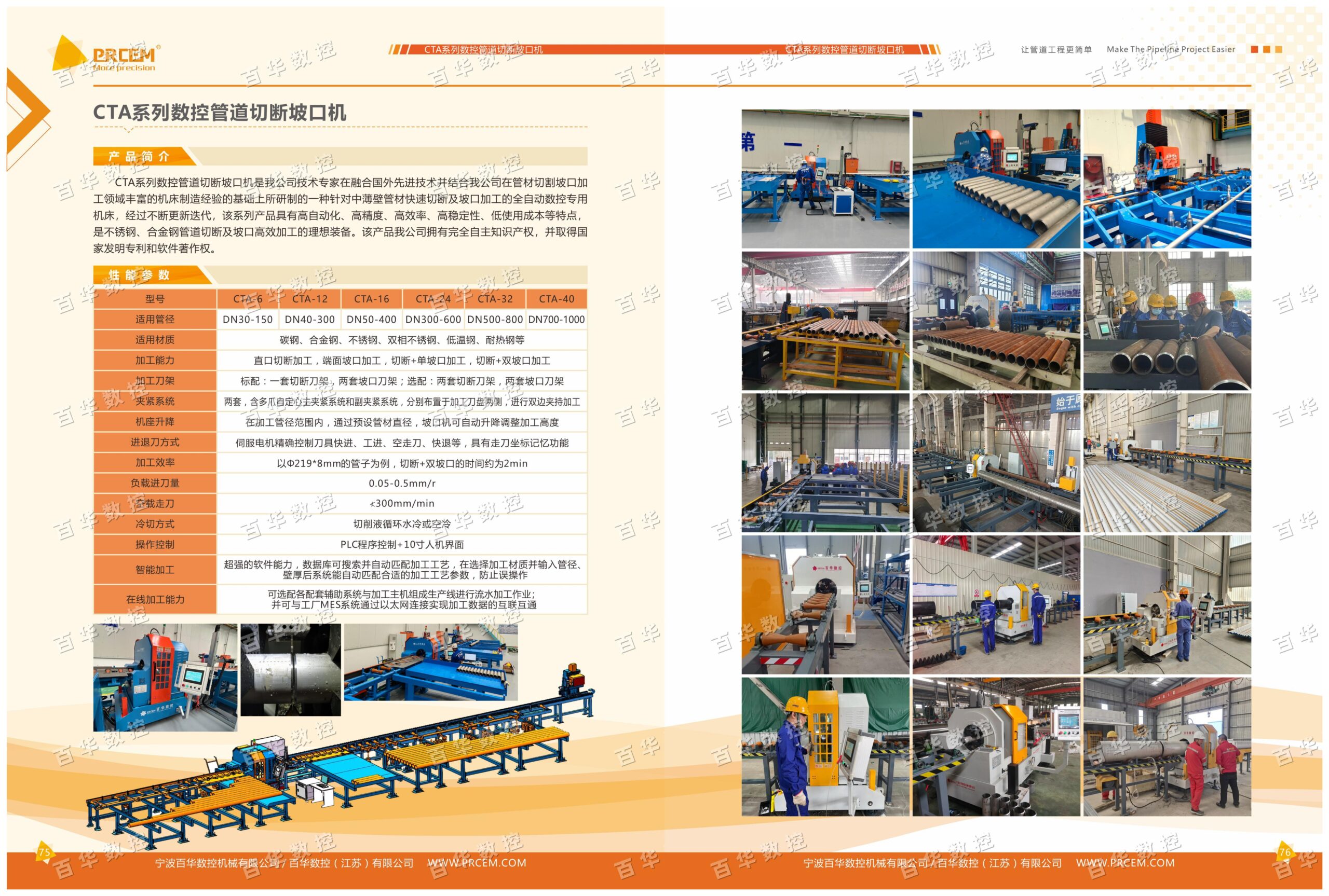 CTA系列数控管道切断坡口机是我公司技术专家在融合国外先进技术并结合我公司在管材切割坡口加工领域丰富的机床制造经验的基础上所研制的一种针对中薄壁管材快速切断及坡口加工的全自动数控专用机床,经过不断更新迭代,该系列产品具有高自动化、高精度、高效率、高稳定性、低使用成本等特点,是不锈钢、合金钢管道切断及坡口高效加工的理想装备。该产品我公司拥有完全自主的知识产权,并取得国家发明专利。